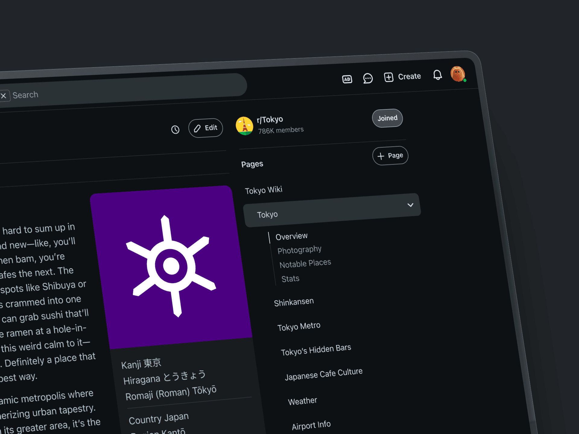 A more social vision for creating community knowledge hubs.I helped rebuild Reddit wikis to make them more social and easier to use. The new experience features a modernized page builder for rich layouts, better navigation for discovery, and tools that turn wikis into collaborative knowledge hubs.